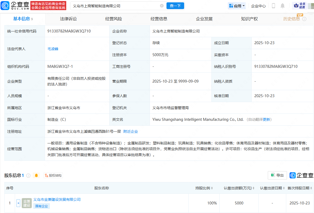近日三亚股票配资,义乌市上商智能制造有限公司成立,法定代表人为毛凌峰,注册资本为5000万元,经营范围包含:通用设备制造(不含特种设备制造);金属制品研发;塑料制品制造;玩具制造;化妆品零售等。企查查股权穿透显示,该公司由义乌市金萧建设发展有限公司全资持股。