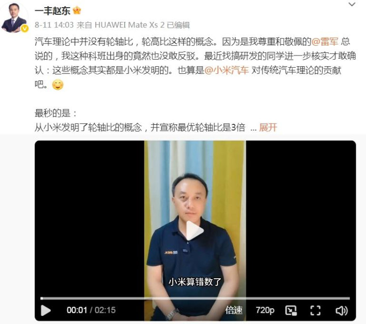 当天傍晚,赵东在最新发布的微博视频中回应称,自己之前说“轮轴比”“轮高比”这些参数是小米定义的,是抱着学习的态度来讨论,有人借此攻击小米夸大宣传,并不是自己的本意,如果对小米汽车造成了不良的影响深表歉意。