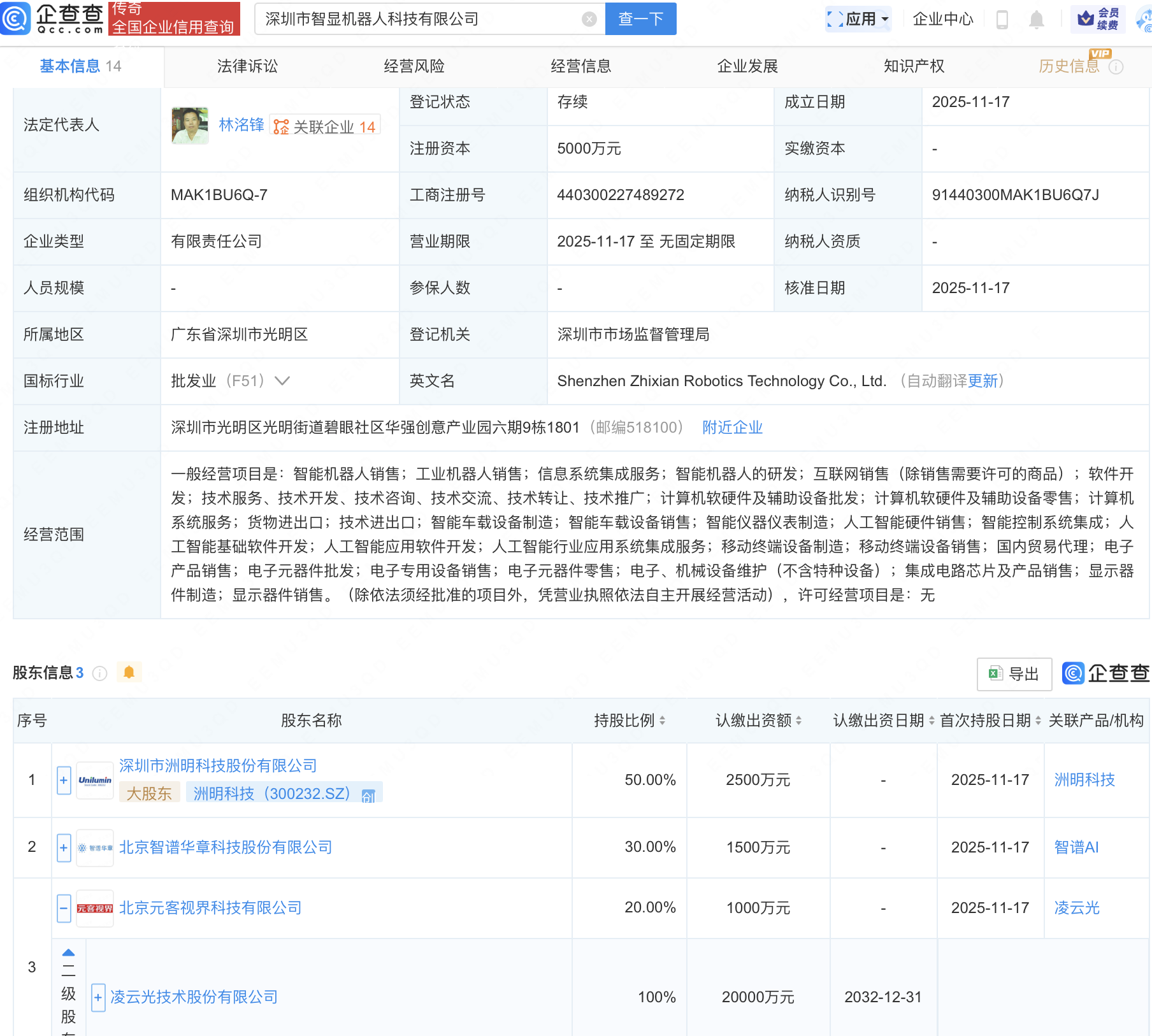 近日,深圳市智显机器人科技有限公司成立,注册资本5000万元配资炒股软件,经营范围包含:智能机器人的研发;人工智能硬件销售;智能控制系统集成;人工智能基础软件开发;人工智能应用软件开发等。企查查股权穿透显示,该公司由智谱AI关联公司北京智谱华章科技股份有限公司、洲明科技(300232)、凌云光(688400)全资子公司北京元客视界科技有限公司共同持股。