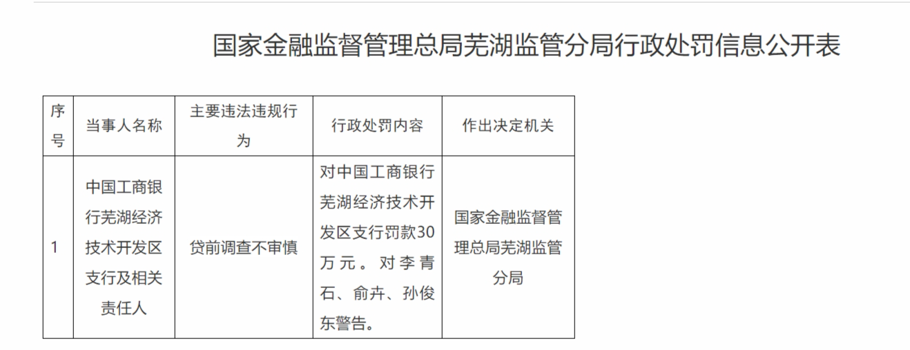 12月23日,国家金融监督管理总局芜湖监管分局行政处罚信息公开表显示,中国工商银行芜湖经济技术开发区支行,贷前调查不审慎配资炒股软件,被罚款30万元;责任人对李青石、俞卉、孙俊东被警告。